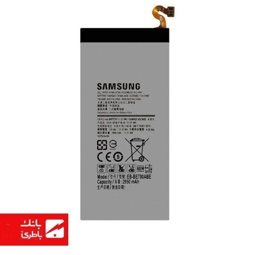 باتری گوشی سامسونگ A7/E7 با کدفنی EB-BA700ABE با 3 ماه گارانتی میباشد. این باتری با ظرفیت ۲۹۵۰ میلیآمپری از نوع لیتیوم-یون (Li-ion) با ولتاژ ۳.۸ ولت میباشد که دارای گارانتی تعویض نیز است.